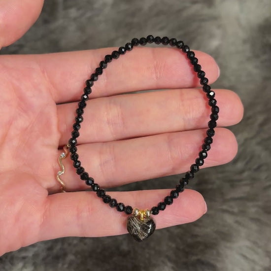 Flexibles, filigranes Armband aus Turmalin und einem Herzanhänger mit eingearbeitetem Fell oder Asche.