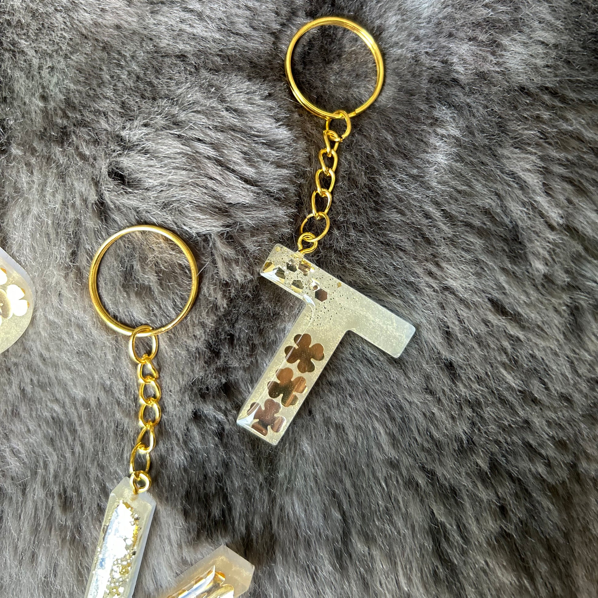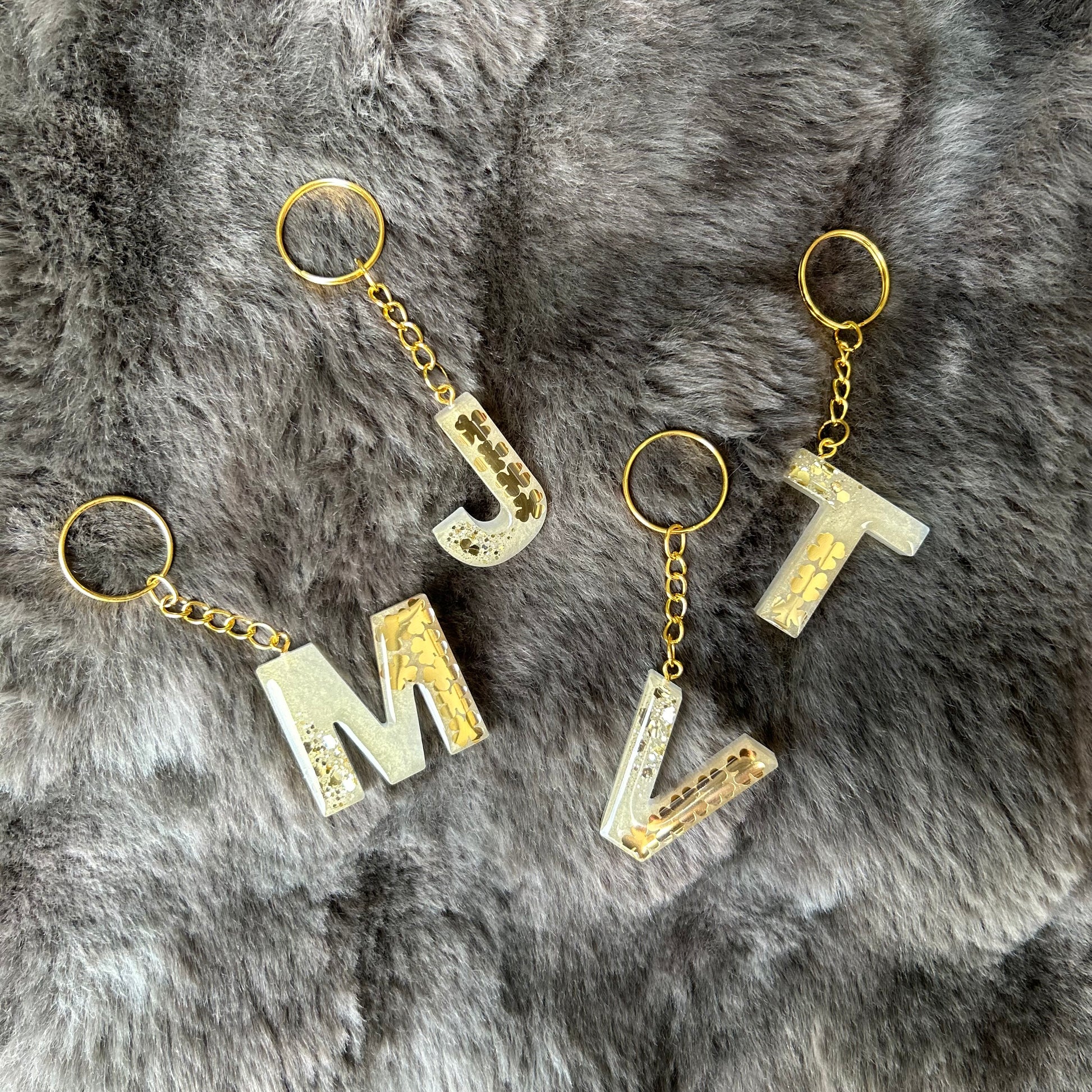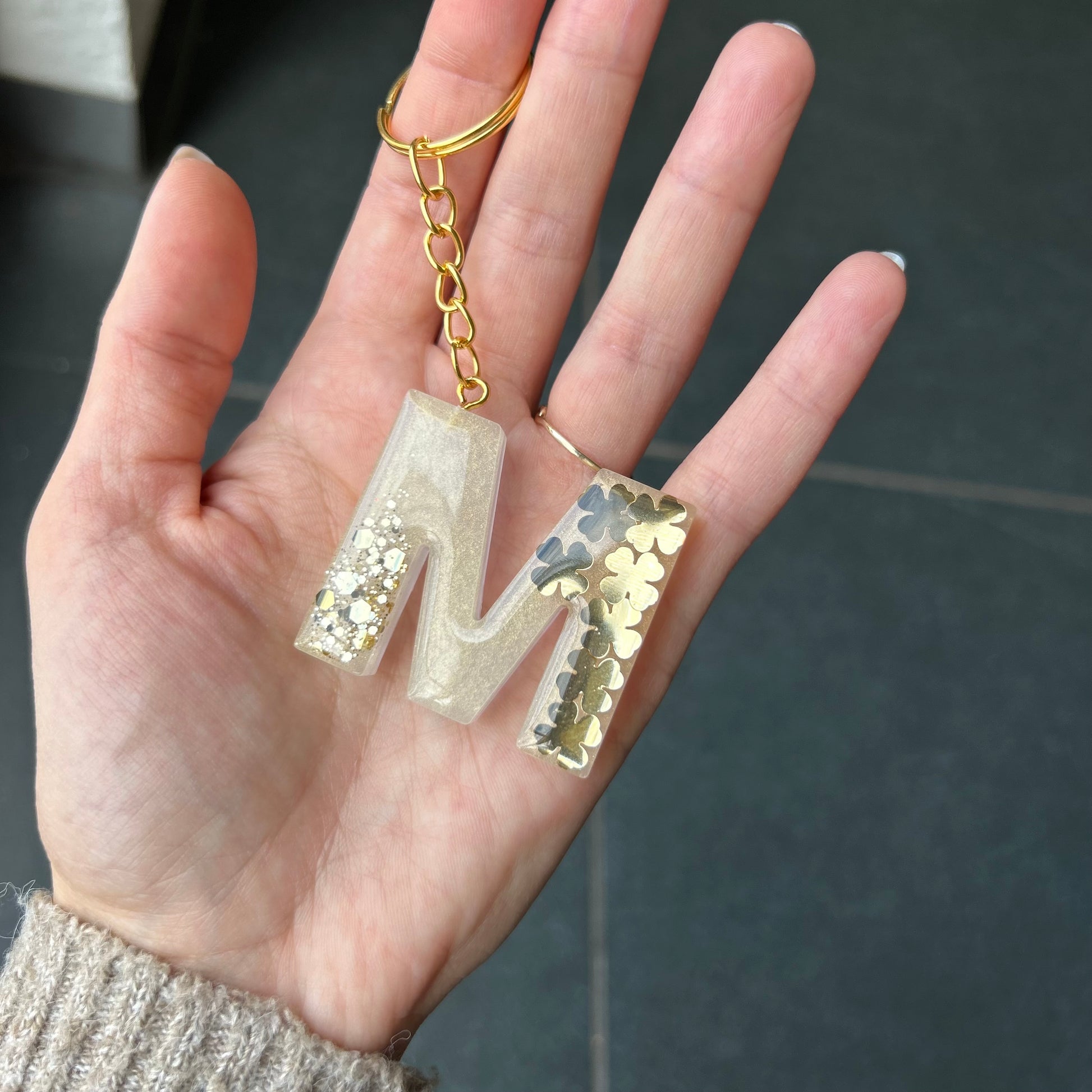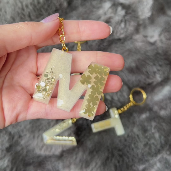 Wunderschöne Buchstaben Schlüsselanhänger aus Epoxidharz mit goldenen Kleeblättern. Ein ganz besonderes Geschenk als Glücksbringer.