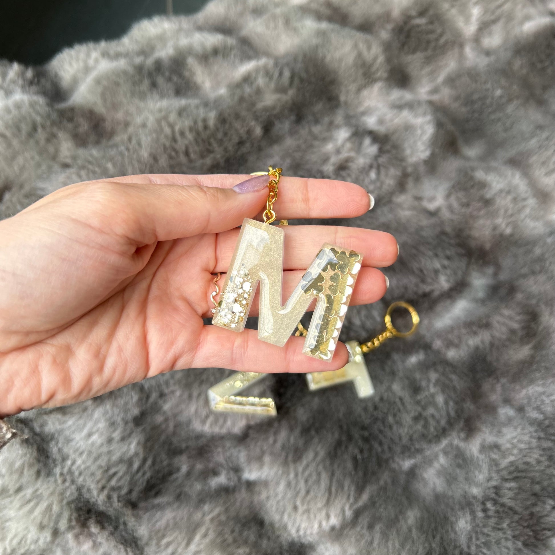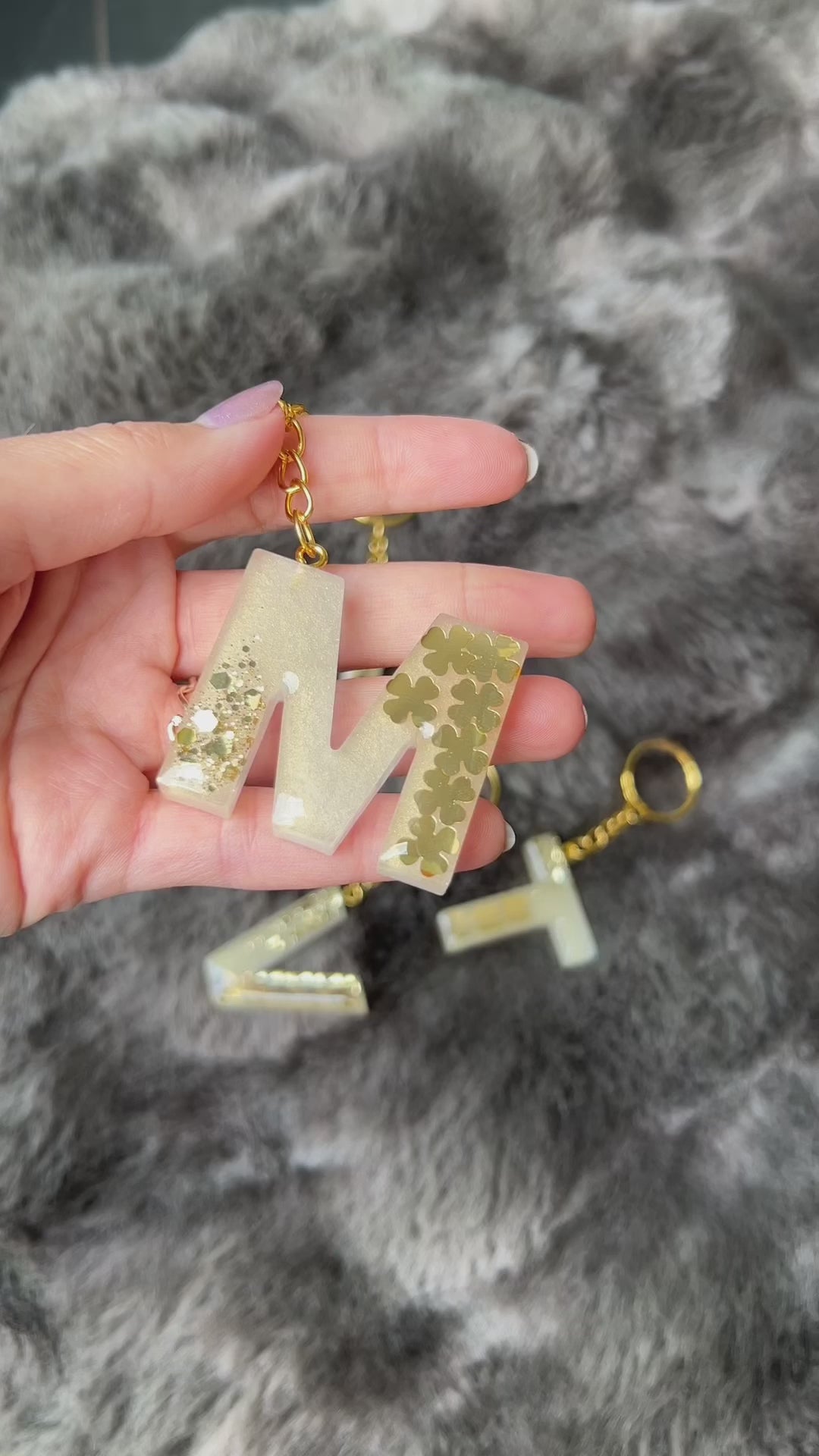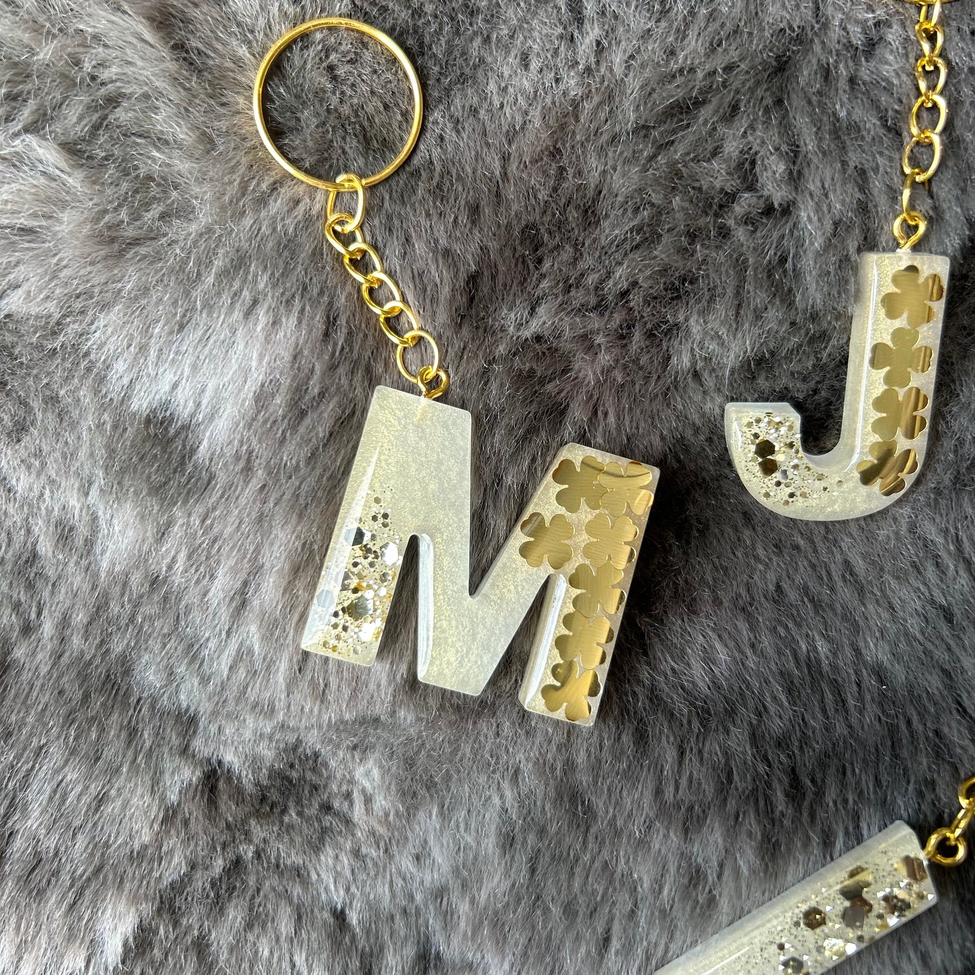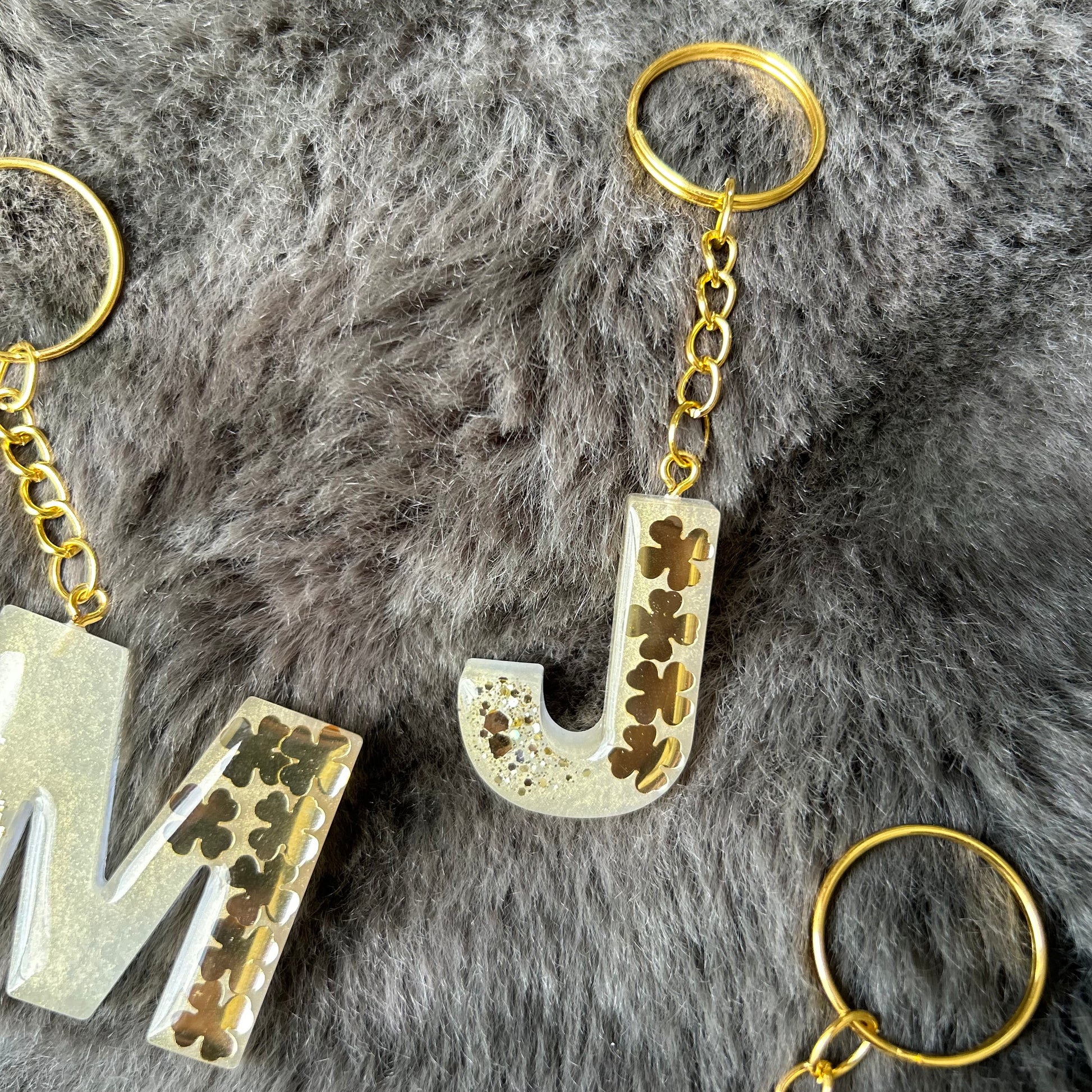 Wunderschöne Buchstaben Schlüsselanhänger aus Epoxidharz mit goldenen Kleeblättern. Ein ganz besonderes Geschenk als Glücksbringer.